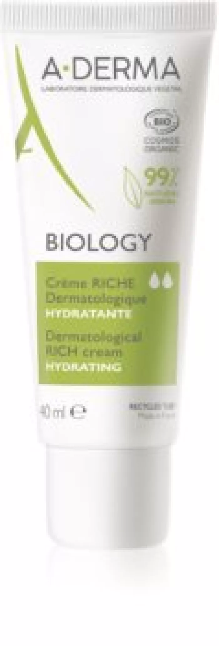 A-DERMA BIOLOGY Creme Riche Dermatologique Hydratante Dermatological Nourishing Cream Moisturizing versorgt trockene Haut rund um die Uhr mit Feuchtigkeit. Kosmetikprodukt mit BIO-Zertifizierung.