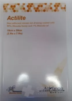 Antihaftbeschichteter Bezug aus gestrickter Viskose. Die Abdeckung verhindert oder reduziert wirksam die bakterielle Besiedlung der Wunde, schont die Haut und sorgt für ein feuchtes Milieu in der Wunde, das die Heilung fördert. Die Substanz, mit der die Hülle durchtränkt ist, ist eine Kombination aus Manuka-Honig und Manuka-Öl, die die antimikrobielle Wirkung erhöht, sodass eine kleine Menge Honig zum Durchtränken der Hülle verwendet werden kann.