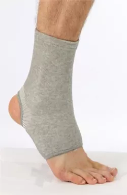 Orthese aus flexiblem, atmungsaktivem Material, dessen Hauptbestandteil Bambusfaser ist, mit Zusatz von Baumwolle und Elasthan.