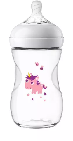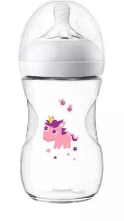Universelle Babyflasche mit extra weichem Sauger mit langsamem Trinkfluss. Die Flasche besteht aus Polypropylen (PP), das halbtransparent ist und ein Farbbild aufweist. Enthält kein BPA (Bisphenol A).