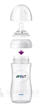 Universalflasche. Babyflasche mit zusätzlichem Sauger AVENT Natural mit mittlerem Durchfluss (3 Löcher im Sauger). Die Flasche besteht aus Polypropylen (PP), das halbtransparent und milchig ist. Enthält kein BPA (Bisphenol A).