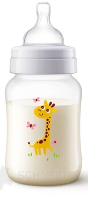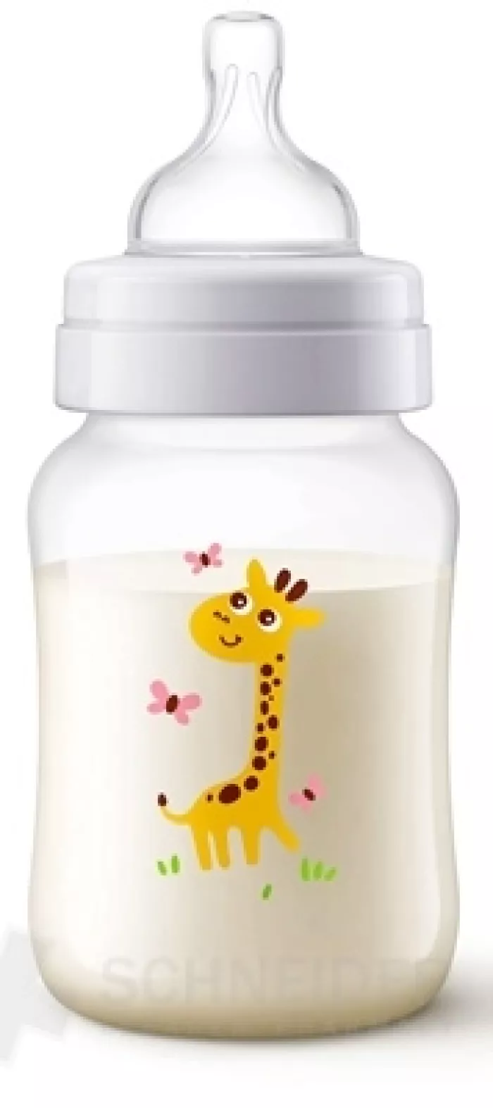 Universalflasche mit vielseitigem Einsatz. Antikolische Babyflasche mit weichem Sauger, langsamer Trinkfluss (zwei Löcher im Sauger). Die Flasche besteht aus halbtransparentem Polypropylen (PP) in milchiger Farbe mit dem Bild einer Giraffe.