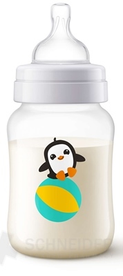 Universalflasche mit vielseitigem Einsatz. Antikolische Babyflasche mit weichem Sauger, langsamer Trinkfluss (zwei Löcher im Sauger). Die Flasche besteht aus halbtransparentem Polypropylen (PP) in milchiger Farbe mit dem Bild eines Pinguins.
