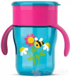 Der erste echte Becher 260 ml. Farbige Version für Mädchen, mit Henkeln. Enthält kein Bisphenol (0 % BPA), Material: Polypropylen (PP).