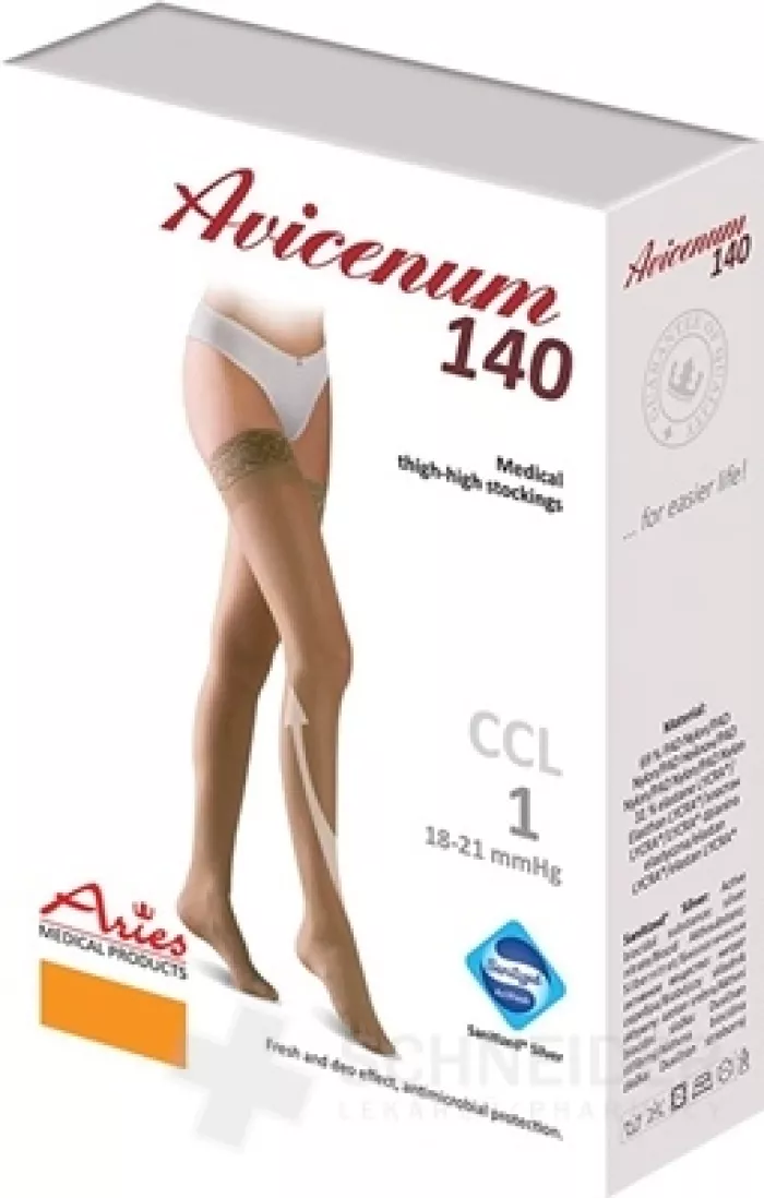 Medizinische Oberschenkelstrümpfe mit selbsthaltender Spitze gehören aufgrund ihres Drucks zur Kompressionsklasse I. Sie haben eine verstärkte Ferse. Die antimikrobielle Behandlung Sanitized Silver schützt vor unangenehmen Gerüchen.
