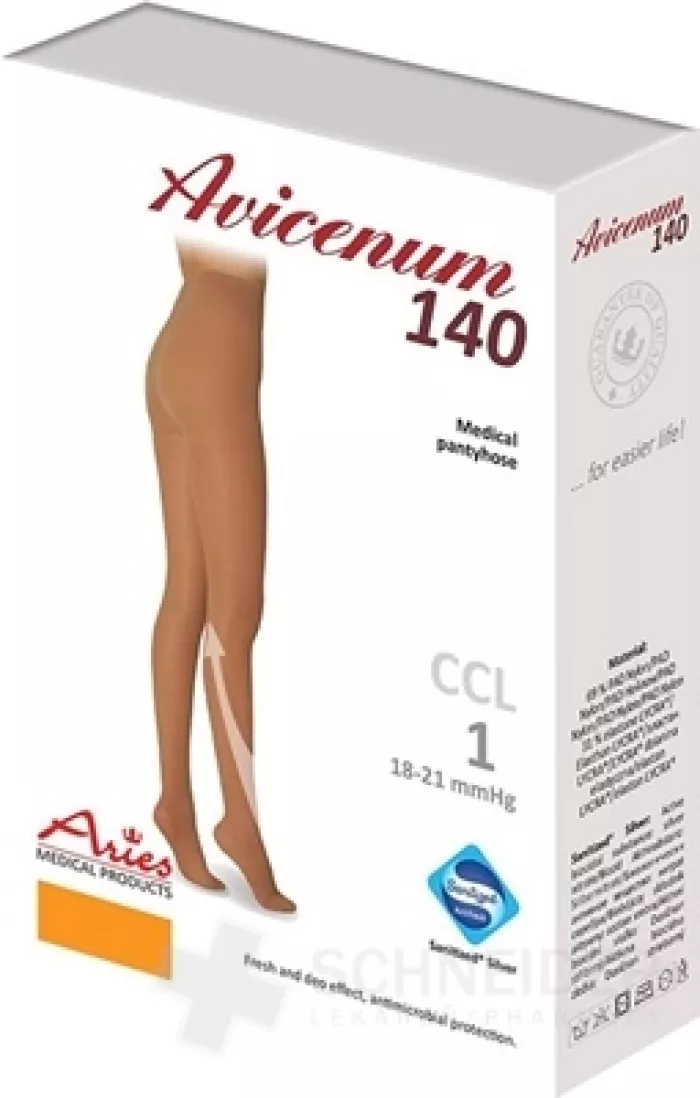 Stützstrumpfhosen AVICENUM 140 gehören aufgrund ihres Drucks zur I. Kompressionsklasse. Sie haben eine verstärkte Ferse. Die antimikrobielle Sanitized Silver-Behandlung schützt vor unangenehmen Gerüchen. Strümpfe