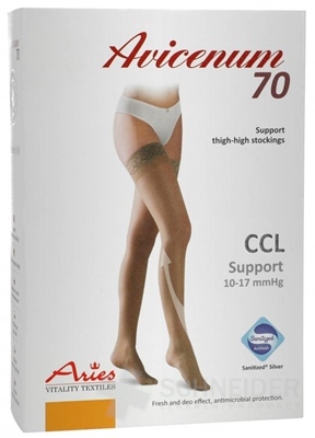Stützstrümpfe mit selbsthaltender Spitze gehören zur Kompressionsklasse A (Druck im Knöchelbereich: 10-14 mmHg). Die antimikrobielle Behandlung Sanitized Silver schützt vor unangenehmen Gerüchen. Zusammensetzung: 76 % Nylon, 24 % Elastan-Lycra.