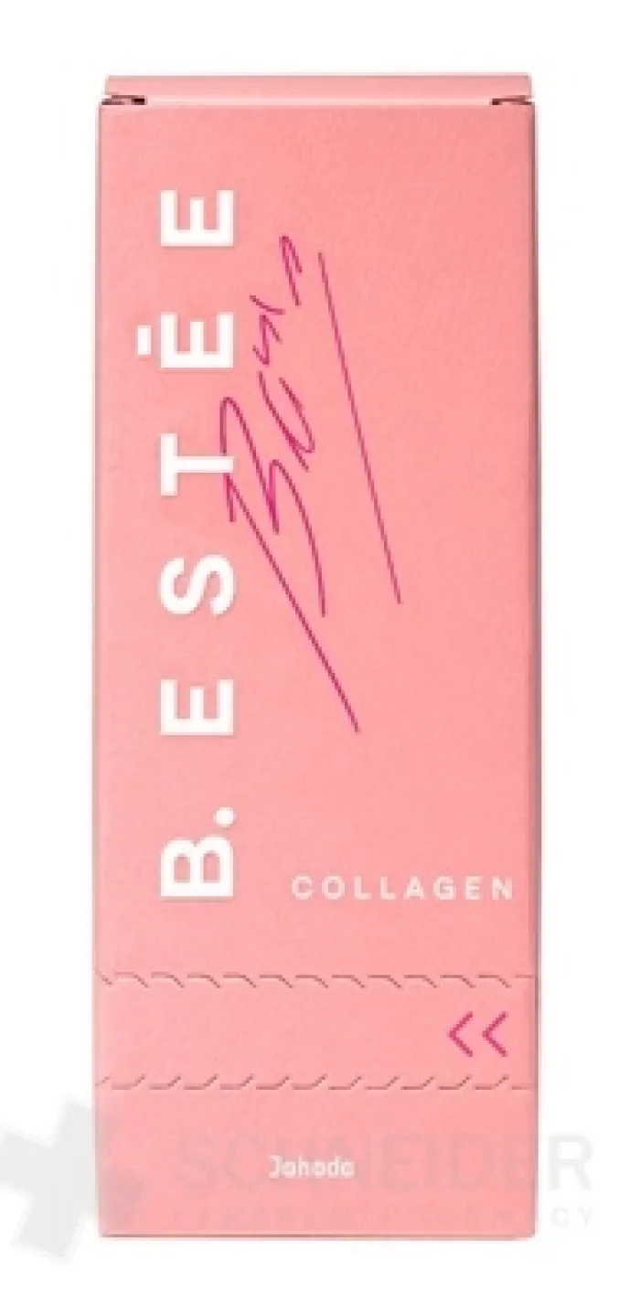 Nahrungsergänzungsmittel, Meereskollagen (hydrolysiert) mit Vitamin C, Hyaluronsäure, mit Erdbeergeschmack. Mit Steviolglykosiden gesüßt.