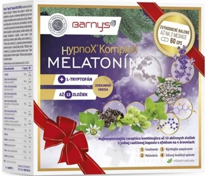 Zusammensetzung: (Inhaltsstoffe in 1 Kapsel (0,835 g)): L-Tryptophan 150 mg, Extrakt aus Passionsblumenblüten (Passiflora incarnata, Extrakt 4:1) 100 mg, Extrakt aus Hopfenzapfen (Humulus lupulus, Extrakt 4:1) ) 100 mg, Extrakt aus den Blüten der Zitronenmelisse (Melissa officinalis, Extrakt 5:1) 100 mg, Extrakt aus der Wurzel des Baldrians (Valeriana officinalis, ≥ 0,8 % Valeriansäure, Extrakt 15:1) 90 mg, Füllstoff (Maltodextrin). ), Schmalblättriger Lavendel (Lavandula angustifolia, Extrakt 4:1) Extrakt 40 mg, L-Theanin (Camellia sinensis Grünteeblatt-Extrakt, 25:1 Extrakt) 10 mg, Trennmittel (Magnesiumstearat), Niacin (Vitamin B3, Nicotinamid) 4 mg (25 % RDA), Melatonin 1 mg, Riboflavin (Vitamin B2, Riboflavin) 0,7 mg (50 % RDA), Vitamin B6 (Pyridoxinhydrochlorid) 0,7 mg (50 % RDA), Thiamin (Vitamin B1, Thiaminhydrochlorid) 0,55 mg (50 % RVH), Vitamin B12 [Cyanocobalamin, Trägerstoff (Maltodextrin)] 1,25 µg (50 % RVH). Die Kapsel besteht aus Hydroxypropylmethylcellulose.