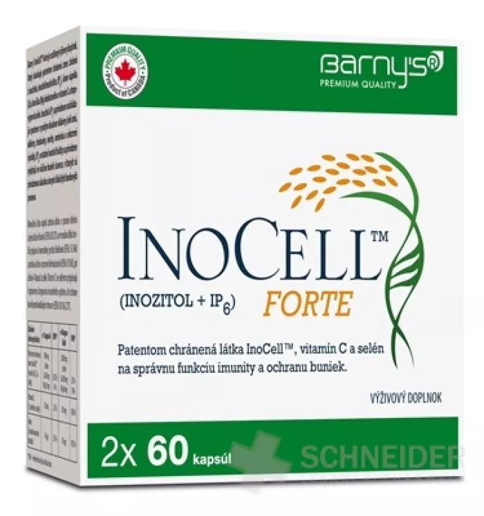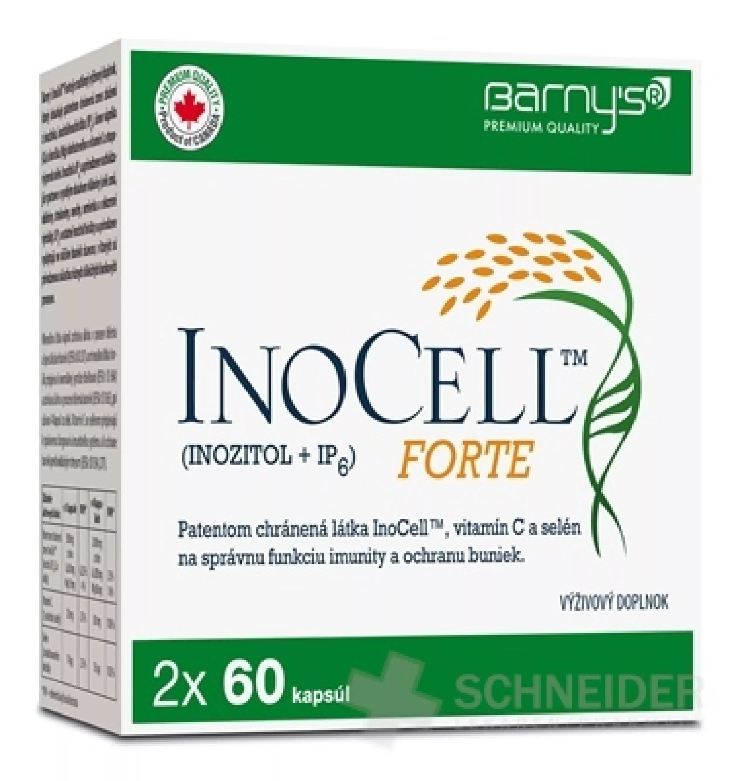Barny's InoCell™ Forte ist ein pflanzliches Nahrungsergänzungsmittel, das eine patentgeschützte Mischung bestehend aus Inositol, Inositolhexaphosphat (IP6), Calcium (Ca) und Magnesium (Mg)-Ionen enthält, angereichert mit Vitamin C und dem Spurenelement Selen. Inositol und IP6 kommen natürlicherweise in Getreide (Reis, Mais), Hülsenfrüchten, Nüssen und Samen vor.