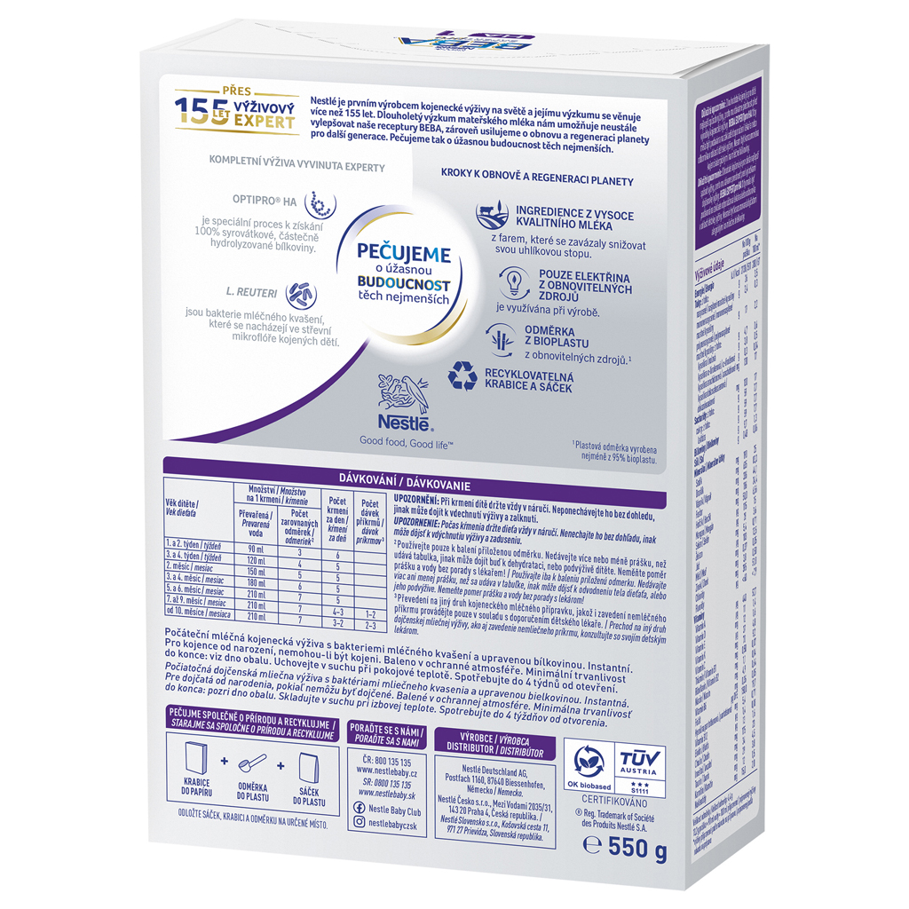 BEBA® EXPERTpro HA 1 ist eine Säuglingsnahrung für Neugeborene. Sie enthält eine einzigartige Kombination aus teilhydrolysiertem Protein, gewonnen durch das OPTIPRO® HA-Verfahren, L. reuteri-Bakterien, Vitaminen* und Mineralstoffen*, um den Bedürfnissen Ihres Babys gerecht zu werden. *Gemäß den Anforderungen der geltenden Gesetzgebung. Wir sind Experten auf dem Gebiet der Säuglingsernährung und entwickeln unsere Rezepturen stetig weiter, um Ihren Kleinen nur das Beste zu bieten. Die Säuglingsnahrung mit teilhydrolysiertem Protein finden Sie im Regal in silberner Verpackung mit dem EXPERTpro HA-Label. BEBA® EXPERTpro HA 1 Säuglingsnahrung enthält eine Kombination einzigartiger Inhaltsstoffe, deren Wirksamkeit klinisch nachgewiesen ist: - Darmbakterien L. reuteri - Milchsäurebakterien, die in der Darmflora gestillter Säuglinge vorkommen - Teilweise hydrolysiertes Protein - OPRIPRO HA® - ein spezielles Verfahren zur Gewinnung von 100 % teilweise hydrolysiertem Molkenprotein - OHNE Palmöl Zusammensetzung: LAKTOSE (aus MILCH), pflanzliche Öle (Sonnenblumenöl mit hohem Ölsäuregehalt, Rapsöl mit niedrigem Erucasäuregehalt, Sonnenblumenöl), enzymatisch hydrolysiertes MOLKENproteinkonzentrat, Mineralstoffe (Kaliumsalze der Orthophosphorsäure, Calciumsalze der Citronensäure, Kaliumchlorid, Magnesiumchlorid, Natriumchlorid, Eisensulfat, Zinksulfat, Kupfersulfat, Mangansulfat, Kaliumiodid, Natriumselenat), Cholintartrat, Mortierella alpina Öl, Schizochytrium sp. Mikroalgenöl, L-Arginin, Vitamine (Natrium-L-ascorbat, Calcium-D-pantothenat, Nicotinamid, DL-alpha-Tocopherylacetat, Riboflavin, Thiaminmononitrat, Retinylacetat, Pyridoxinhydrochlorid, Folsäure, Phyllochinon, D-Biotin, Cholecalciferol, Cyanocobalamin), L-Histidin, L-Phenylalanin, Milchsäurebakterien (Limosilactobacillus reuteri DSM 17938¹; 8,9 x 10⁷ KBE / 100 g Pulver am Ende der Mindesthaltbarkeit), Inositol, Taurin, Nukleotide [Cytidin-5′-monophosphat (CMP), Natriumsalze von Uridin-5′-phosphat (UMP), Adenosin-5′-phosphat (AMP), Natriumsalze von Guanosin-5´-phosphat (GMP)], L-Carnitin. ¹Lizenz von BioGaia AB. ALLERGENE SIND IN GROSSBUCHSTABEN HERVORRAGEND. Pro 100 g Pulver: Energie: kJ / kcal 2138 / 511 Fett: g 26 davon: gesättigte Fettsäuren: g 2,4 - einfach ungesättigte Fettsäuren: g 17 - mehrfach ungesättigte Fettsäuren: g 4,7 davon: Linolsäure: g 3,8 - Alpha-Linolensäure: g 0,3 - Arachidonsäure: mg 130 - Docosahexaensäure: mg 130 Kohlenhydrate: g 59 davon: Zucker: g 59, davon Laktose: g 59 Eiweiß: g 9,7 Salz: g 0,48. Mineralstoffe: Natrium: 190 mg, Kalium: 635 mg, Calcium: 336 mg, Phosphor: 186 mg, Magnesium: 50,0 mg, Mangan: 115 µg, Selen: 28 µg, Eisen: 5,4 mg, Jod: 103 µg, Kupfer: 0,37 mg, Zink: 3,8 mg, Chloride: 395 mg, Fluoride: <60 µg. Vitamine: Vitamin A: 440 µg, Vitamin D: 11 µg, Vitamin E: 12 mg, Vitamin K: 37 µg, Vitamin C: 70 mg, Thiamin: 0,50 mg, Riboflavin: 1,1 mg, Niacin: 4,9 mg, Vitamin B6: 0,36 mg, Folsäure: 150,0 µg DFE, Pantothensäure: 5,4 mg, Vitamin B12: µg 1,4 Biotin / Biotin: µg 13 Cholin / Cholin: mg 175 Inositol / Inositol: mg 34 Taurin / Taurin: mg 29 Carnitin / Carnitin: mg 12 Nukleotide: mg 15,0. Zubereitung: 1. Waschen Sie Ihre Hände gründlich, bevor Sie die Säuglingsnahrung zubereiten. 2. Reinigen Sie Flasche, Verschluss und Sauger gründlich und kochen Sie sie 5 Minuten lang aus. Beachten Sie bei Verwendung eines Dampfsterilisators die Gebrauchsanweisung. 3. Kochen Sie für Säuglinge geeignetes Trinkwasser 5 Minuten lang ab und lassen Sie es abkühlen. 4. Geben Sie die Hälfte des abgekochten Wassers (siehe Tabelle), das auf ca. 40 °C abgekühlt ist, in den Behälter. Wassertemperaturen über 45 °C zerstören Milchsäurebakterien. 5. Geben Sie das Pulver mit dem beiliegenden Messbecher (siehe Tabelle) in den Behälter. Der Messbecher muss immer bis zum Rand gefüllt sein! 6. Gut schütteln. 7. Füllen Sie den Behälter mit der restlichen Hälfte des abgekochten Wassers (siehe Tabelle) auf. 8. Nochmals gut schütteln, bis sich das Pulver vollständig aufgelöst hat. 9. Die Temperatur der zubereiteten Nahrung prüfen. 10. Nach jedem Gebrauch die Verpackung fest verschließen und an einem trockenen Ort bei Raumtemperatur aufbewahren. DOSIERUNG: Menge für 1 Mahlzeit: - Alter des Kindes 1. und 2. Woche: 90 ml abgekochtes Wasser, Anzahl gestrichener Messbecher² 3, Anzahl der Mahlzeiten pro Tag 6, Anzahl der Portionen Beikost³ -; - Alter des Kindes 3. und 4. Woche: 120 ml abgekochtes Wasser, Anzahl gestrichener Messbecher² 4, Anzahl der Mahlzeiten pro Tag 5, Anzahl der Portionen Beikost³ -; - Alter des Kindes 2. Monat: 150 ml abgekochtes Wasser, Anzahl gestrichener Messbecher² 5, Anzahl der Mahlzeiten pro Tag 5, Anzahl der Portionen Beikost³ -; - Alter des Kindes im 3. und 4. Monat: 180 ml abgekochtes Wasser, Anzahl gestrichener Messbecher² 6, Anzahl der Mahlzeiten pro Tag 5, Anzahl der Portionen Beikost³ -; - Alter des Kindes im 5. und 6. Monat: 210 ml abgekochtes Wasser, Anzahl gestrichener Messbecher² 7, Anzahl der Mahlzeiten pro Tag 5, Anzahl der Portionen Beikost³ -; - Alter des Kindes im Alter von 7 bis 9 Monaten: 210 ml abgekochtes Wasser, Anzahl gestrichener Messlöffel² 7, Anzahl der Mahlzeiten pro Tag 4-3, Anzahl der Beikostmahlzeiten³ 1-2; - Alter des Kindes ab 10 Monaten: 210 ml abgekochtes Wasser, Anzahl gestrichener Messlöffel² 7, Anzahl der Mahlzeiten pro Tag 3-2, Anzahl der Beikostmahlzeiten³ 2-3. Messlöffelgröße: 4,4 g²Verwenden Sie ausschließlich den beiliegenden Messlöffel. Geben Sie nicht mehr oder weniger Pulver als in der Tabelle angegeben, da es sonst zu Dehydrierung oder Mangelernährung kommen kann. Ändern Sie das Mischverhältnis von Pulver zu Wasser nicht ohne Rücksprache mit einem Arzt!³Sprechen Sie mit Ihrem Kinderarzt, bevor Sie auf eine andere Säuglingsnahrung umsteigen oder milchfreie Beikost einführen. Wichtiger Hinweis: Stillen ist die beste Ernährung für Ihr Baby und wird daher S