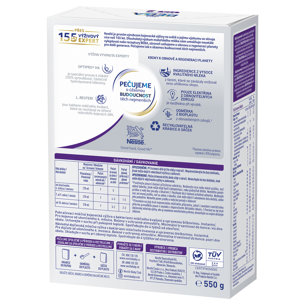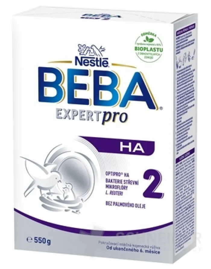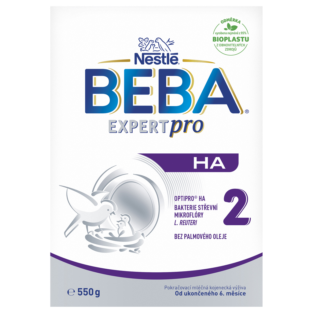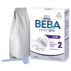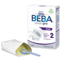 BEBA® EXPERTpro HA 2 ist eine Säuglingsnahrung für Babys ab dem 6. Lebensmonat. Sie enthält eine einzigartige Kombination aus teilhydrolysiertem Protein (gewonnen durch das OPTIPRO® HA-Verfahren), L. reuteri-Bakterien, Vitaminen* und Mineralstoffen*, um den Bedürfnissen Ihres Babys gerecht zu werden. *Gemäß den Anforderungen der geltenden Gesetzgebung. Als Experten für Säuglingsernährung entwickeln wir unsere Rezepturen stetig weiter, um Ihren Kleinen nur das Beste zu bieten. Die Säuglingsnahrung mit teilhydrolysiertem Protein finden Sie im Regal an der silbernen Verpackung mit dem EXPERTpro HA-Label. BEBA EXPERTpro HA 2 Säuglingsnahrung enthält eine Kombination einzigartiger Inhaltsstoffe, deren Wirksamkeit klinisch nachgewiesen ist: - Darmbakterien L. reuteri - Milchsäurebakterien, die in der Darmflora gestillter Säuglinge vorkommen - Teilweise hydrolysiertes Protein - OPRIPRO HA® - ein spezielles Verfahren zur Gewinnung von 100 % teilweise hydrolysiertem Molkenprotein - OHNE Palmöl Zutaten: LAKTOSE (aus MILCH), pflanzliche Öle (Sonnenblumenöl mit höherem Ölsäureanteil, Rapsöl mit niedrigem Erucasäuregehalt, Sonnenblumenöl), enzymatisch hydrolysiertes MOLKENproteinkonzentrat, Mineralstoffe (Calciumsalze der Zitronensäure, Calciumsalze der Orthophosphorsäure, Kaliumsalze der Orthophosphorsäure, Kaliumchlorid, Magnesiumchlorid, Natriumsalze der Orthophosphorsäure, Eisen(II)-sulfat, Zinksulfat, Kupfersulfat, Mangansulfat, Kaliumiodid, Natriumselenat), Mortierella alpina Öl, Schizochytrium sp. Mikroalgenöl, L-Arginin, Vitamine (Natrium-L-ascorbat, Calcium-D-pantothenat, DL-alpha-Tocopherylacetat, Nicotinamid, Riboflavin, Thiaminmononitrat, Retinylacetat, Pyridoxinhydrochlorid, Folsäure, Phyllochinon, D-Biotin, Cholecalciferol, Cyanocobalamin), L-Histidin, L-Phenylalanin, Milchsäurebakterien (Limosilactobacillus reuteri DSM 17938¹; 8,9 × 10⁷ KBE/100 g Pulver am Ende der Mindesthaltbarkeit). ¹Lizenz BioGaia AB. ALLERGENE SIND IN GROSSBUCHSTABEN HERVORRAGEND. Pro 100 g Pulver: Energie: kJ / kcal 2050 / 490 Fett: g 23 davon: gesättigte Fettsäuren: g 2,2 - einfach ungesättigte Fettsäuren: g 15 - mehrfach ungesättigte Fettsäuren: g 4,3 davon: - Linolsäure: mg 3500 - Alpha-Linolensäure: mg 300 - Arachidonsäure: mg 123 - Docosahexaensäure: mg 123 Kohlenhydrate: g 61 davon: Zucker: g 61 davon: Laktose: g 61 Eiweiß: g 9,3 Salz: g 0,50. Mineralstoffe: Natrium: mg 200 Kalium: mg 565 Calcium: mg 505 Phosphor: mg 318 Magnesium: mg 50,0 Mangan: µg 115 Selen: µg 28 Eisen: mg 7,5 Jod: µg 98,0 Kupfer: mg 0,38 Zink: mg 3,7 Chloride: mg 370 Fluoride: µg <60. Vitamine: Vitamin A: 420 µg, Vitamin D: 12 µg, Vitamin E: 12 mg, Vitamin K: 37 µg, Vitamin C: 70 mg, Thiamin/Vitamin B1: 0,50 mg, Riboflavin/Vitamin B2: 1,1 mg, Niacin: 4,6 mg, Vitamin B6: 0,36 mg, Folsäure: 150 µg DFE, Pantothensäure: 5,4 mg, Vitamin B12: 1,3 µg, Biotin: 12 µg. Zubereitung: 1. Waschen Sie Ihre Hände gründlich, bevor Sie die Säuglingsnahrung zubereiten. 2. Reinigen Sie Flasche, Verschluss und Sauger gründlich und kochen Sie sie 5 Minuten lang aus. Falls Sie einen Dampfsterilisator verwenden, befolgen Sie die Gebrauchsanweisung. 3. Kochen Sie für Säuglinge geeignetes Trinkwasser 5 Minuten lang ab und lassen Sie es abkühlen. 4. Gießen Sie die Hälfte des abgekochten Wassers (siehe Tabelle), das auf etwa 40 °C abgekühlt ist, in den Behälter. Wassertemperaturen über 45 °C zerstören die Milchsäurebakterien. 5. Verwenden Sie den beiliegenden Messbecher (siehe Tabelle), um das Pulver abzumessen und in den Behälter zu geben. Der Messbecher muss immer bis zum Rand gefüllt sein! 6. Gut schütteln. 7. Füllen Sie den Behälter mit der anderen Hälfte des abgekochten Wassers (siehe Tabelle) auf. 8. Erneut gut schütteln, bis sich das Pulver vollständig aufgelöst hat. 9. Prüfen Sie die Temperatur der zubereiteten Nahrung. 10. Verschließen Sie die Verpackung nach jedem Gebrauch fest und bewahren Sie sie an einem trockenen Ort bei Raumtemperatur auf. DOSIERUNG: Menge pro Mahlzeit: - Alter des Kindes ab Ende des 6. Monats: Abgekochtes Wasser 210 ml, Anzahl gestrichener Messlöffel² 7, Anzahl der Mahlzeiten pro Tag 5, Anzahl der Portionen Beikost³ -; - Alter des Kindes vom 7. bis 9. Monat: 210 ml abgekochtes Wasser, Anzahl gestrichener Messlöffel²: 7, Anzahl der Mahlzeiten pro Tag: 4-3, Anzahl der Portionen Beikost³: 1-2; - Alter des Kindes ab 10 Monaten: 210 ml abgekochtes Wasser, Anzahl gestrichener Messlöffel²: 7, Anzahl der Mahlzeiten pro Tag: 3-2, Anzahl der Portionen Beikost³: 2-3. Messbechergröße: 4,6 g.²Verwenden Sie ausschließlich den beiliegenden Messbecher. Geben Sie nicht mehr oder weniger Pulver als in der Tabelle angegeben, da es sonst zu Dehydrierung oder Mangelernährung kommen kann. Ändern Sie das Verhältnis von Pulver zu Wasser nicht ohne Rücksprache mit einem Arzt!³Sprechen Sie mit Ihrem Kinderarzt, bevor Sie auf eine andere Säuglingsnahrung umsteigen oder milchfreie Beikost einführen. Wichtiger Hinweis: Langfristiges Stillen ist die beste Art der Ernährung Ihres Babys und wird daher gegenüber Säuglingsnahrung bevorzugt. BEBA EXPERTpro HA 2 sollte nur im Rahmen einer gemischten Ernährung gegeben und in den ersten 6 Lebensmonaten nicht als Muttermilchersatz verwendet werden. Es ist nicht für Säuglinge mit einer Milcheiweißallergie geeignet. BEBA EXPERTpro HA 2 sollte nur auf Empfehlung eines Arztes oder einer qualifizierten Fachkraft für Säuglingsernährung verabreicht werden. Warnhinweis: Bereiten Sie immer nur eine Portion zu und verfüttern Sie diese sofort. Nicht verbrauchte Portionen nicht aufbewahren. Befolgen Sie die Zubereitungsanleitung genau, da Sie sonst die Gesundheit Ihres Säuglings gefährden. Warnhinweis: Halten Sie Ihr Baby während des Fütterns immer im Arm. Lassen Sie es nicht unbeaufsichtigt, da es sonst Nährstoffe einatmen und ersticken kann. Trocken und bei Raumtemperatur lagern. Nach dem Öffnen innerhalb