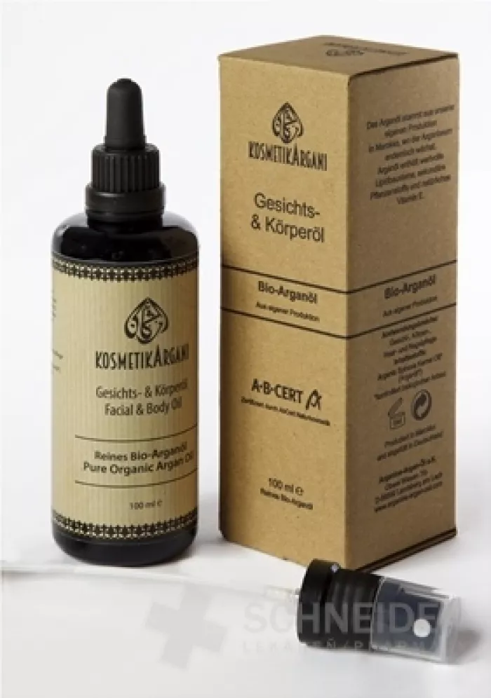 Kosmetisches Öl mit vielseitiger Anwendung. Geeignet zur Pflege der Haut von Gesicht, Körper, Haaren und Nägeln. Kaltgepresst, 100 % Argania spinosa, aus biologischem Anbau (BIO). Herkunftsland Marokko.