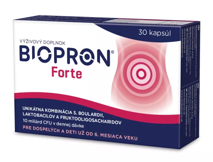 Das Nahrungsergänzungsmittel Biopron® FORTE enthält eine einzigartige Kombination aus Bakterien (Lactobacillus acidophilus, Lactobacillus rhamnosus) und der Hefe Saccharomyces boulardii, ergänzt mit Inulin und Fructooligosacchariden. Es enthält 10 Milliarden KBE (lebende Mikroorganismen) in einer Tagesdosis (in 2 Kapseln).
