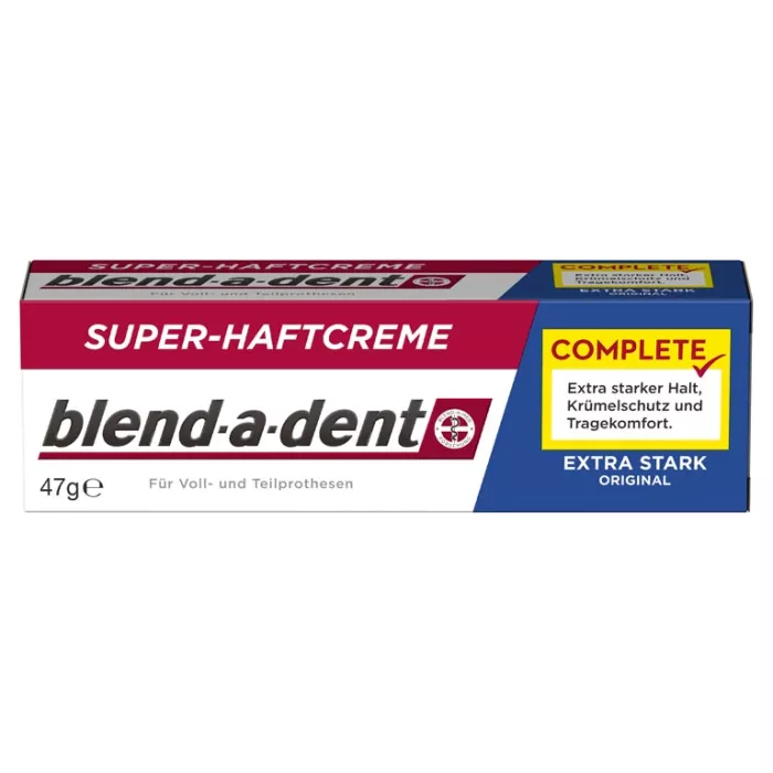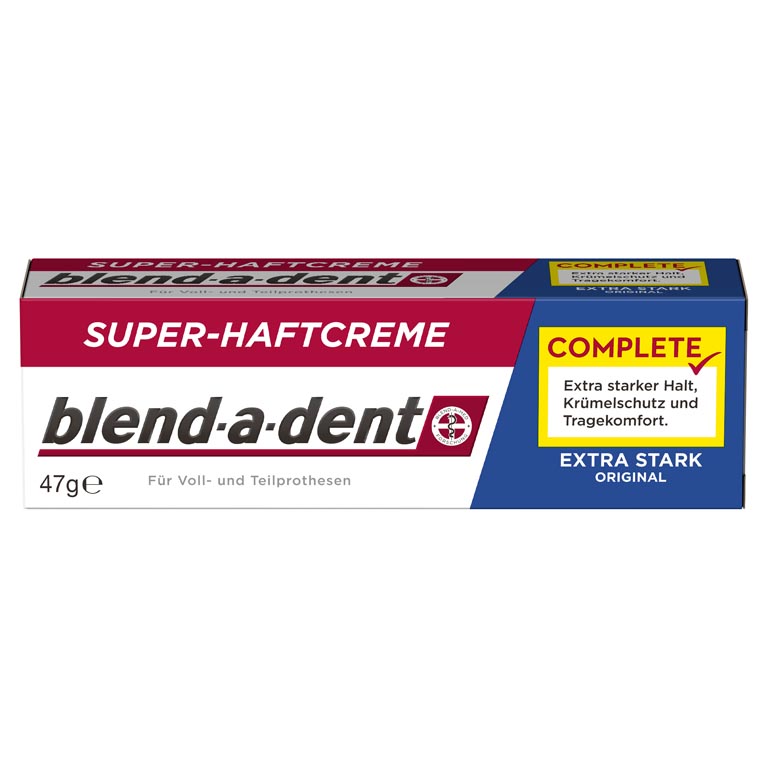Vorbereitung zur Befestigung von Zahnersatz. Blend-a-dent Fixierungscreme sorgt für: