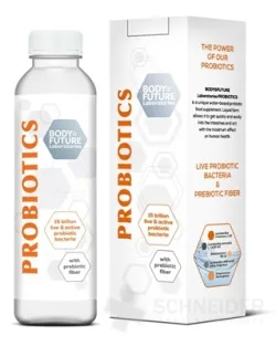 Ein wasserbasiertes Nahrungsergänzungsmittel, das einen Komplex aus fünf Bakterienstämmen (Lactobacillus rhamnosus LGG, Lactobacillus casei, Bifidobacterium Species BB12, Lactobacillus delbrueckii subsp. bulgaricus, Streptococcus thermophilus) und Natriumbutyrat mit schwarzem Johannisbeergeschmack enthält.