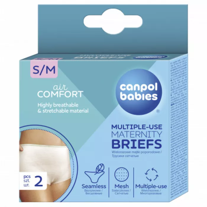 Canpol Babies Multifunktionales Postpartum-Höschen für den Mehrfachgebrauch, in einer Packung mit 2 Stück. Elastische, nahtlose (Mesh-)Höschen bestehen aus atmungsaktivem Nylon.