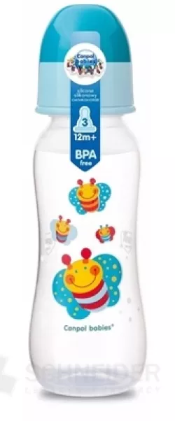 Geformte Babyflasche mit buntem Motiv. Aus Kunststoff (PP) – reißt nicht, enthält kein BPA. Es ist leicht und praktisch. Enthält Silikonschnuller 3 (ab 12 Monaten). Erhältlich in mehreren Farbkombinationen.