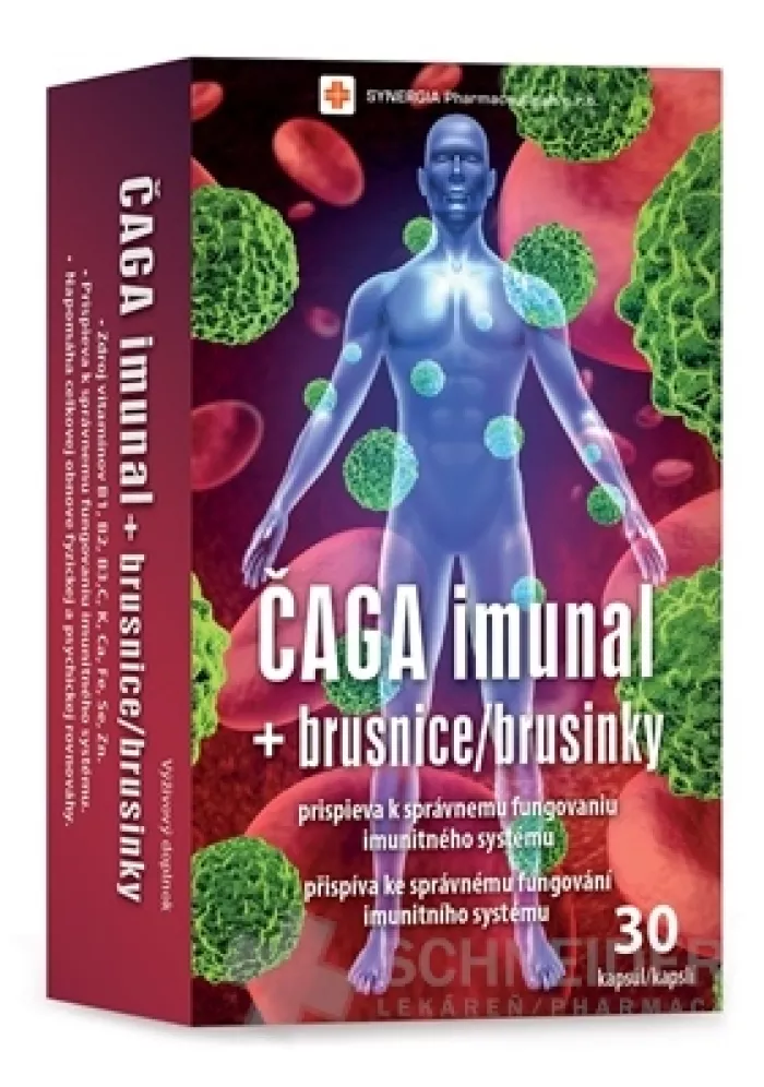 Nahrungsergänzungsmittel mit Chaga-Pilzextrakt (Ryšavec skýmy) – 200 mg in Form von Mikrokapseln (verbessert die Bioabsorption) und Cranberry-Extrakt – 200 mg.