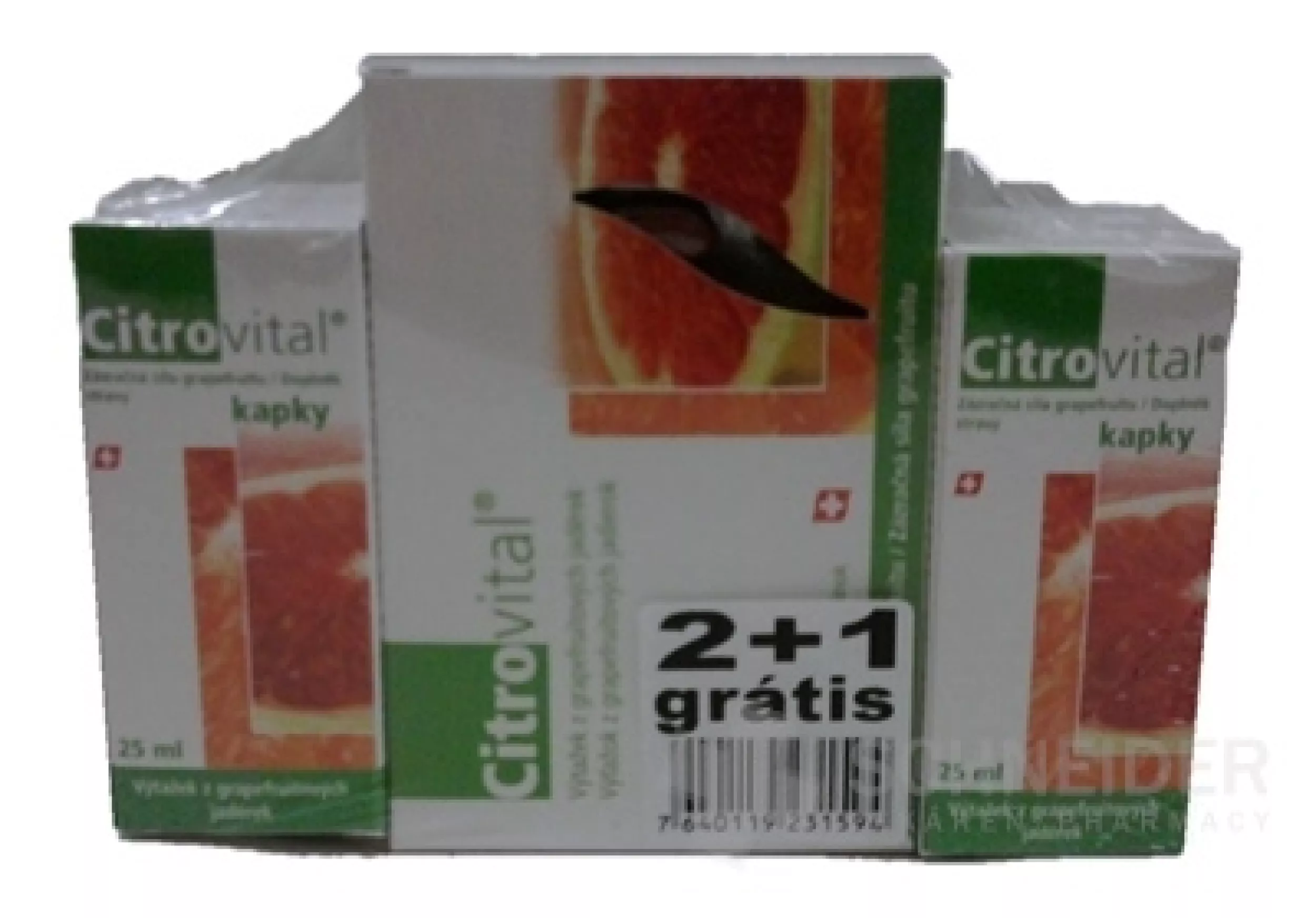 Nahrungsergänzungsmittel Citrovital Mix (Tropfen, Kapseln) ein Naturprodukt mit einem Extrakt aus den Samen der Grapefruit (Citrus paradisi).