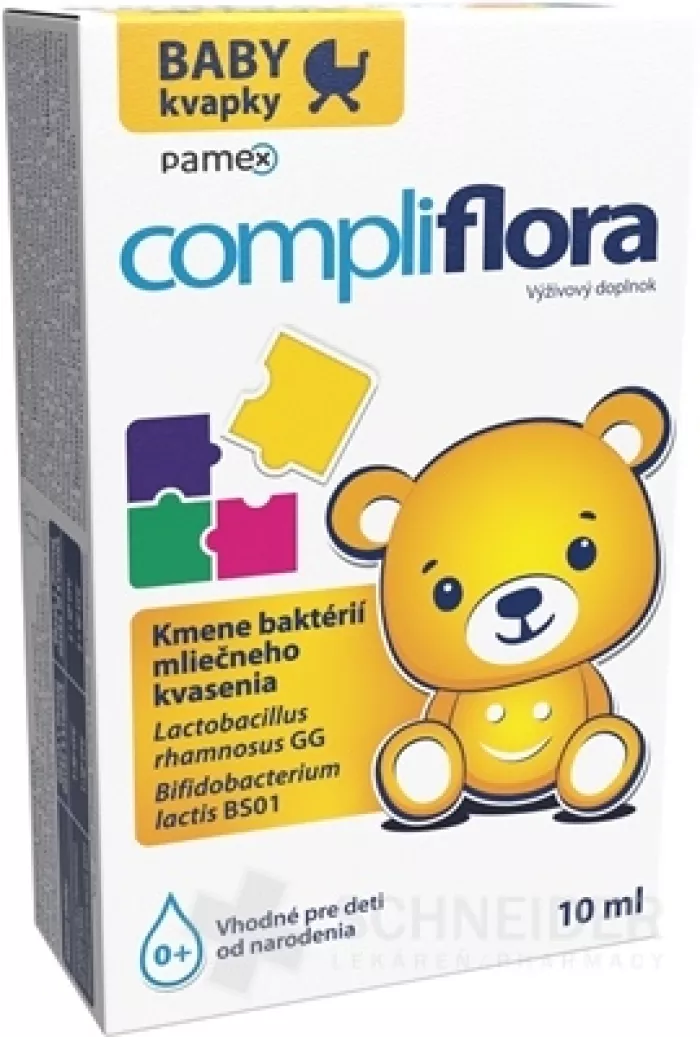 Nahrungsergänzungsmittel. Tropfen in Form einer Suspension. Sie enthalten Mikrokapseln mit lebenden Milchsäurebakterien, die den Dünn- und Dickdarm besiedeln: Lactobacillus rhamnosus GG ATCC 53103, Bifidobacterium lactis BS01.