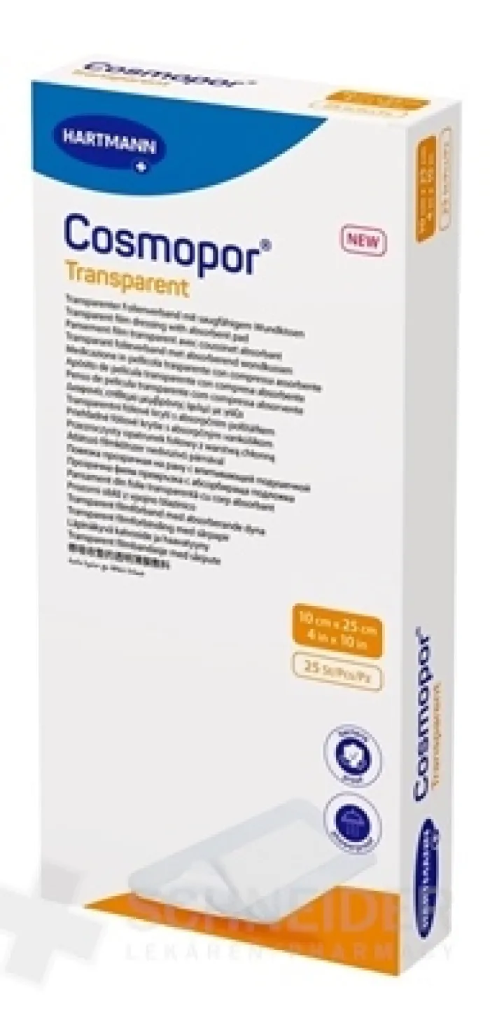 Selbstklebende transparente Folienabdeckung aus teildurchlässiger, wasserfester und transparenter Polyurethanfolie, die mit einer Schicht Polyacrylatkleber überzogen ist und in der Mitte ein saugfähiges Wundkissen aufweist. Das Wundkissen besteht aus Viskosefasern und ist mit einem Polyethylennetz überzogen, das als antihaftbeschichtete Kontaktschicht zur Wunde dient.