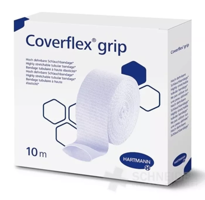Flexibler Schlauchverband. Die Konstruktion des Stoffes garantiert eine Anpassung an den Untergrund, stabilen Sitz und gleichmäßigen, mittleren Druck, der nicht nachgibt. Es ist waschbar und sterilisierbar, es ist beständig gegen Fette, Fett und Schweiß.
