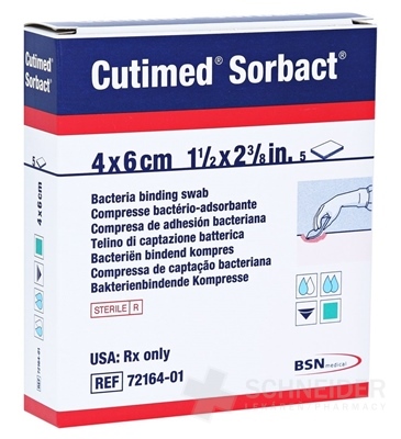 Antimikrobieller Wundverband, der Bakterien und andere Mikroorganismen bindet. Es ist für die Behandlung kontaminierter, kolonisierter und infizierter Wunden vorgesehen. Es besteht aus dem grünen Kontaktmaterial Sorbact®.