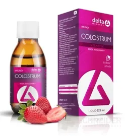 DELTA COLOSTRUM® flüssiges Nahrungsergänzungsmittel, entfettet und kaseinfrei, mit natürlichem Erdbeergeschmack.