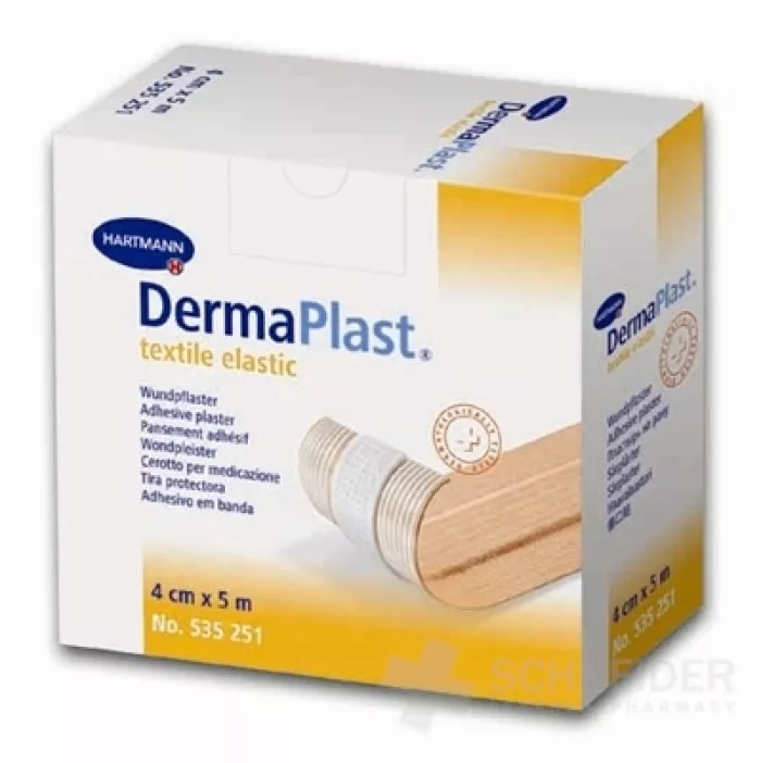 Elastischer Patch aus hautfarbenem Textilgewebe. Das Pflaster ist atmungsaktiv und hypoallergen, da synthetischer Kautschukkleber in Streifen aufgetragen wird. Es ist mit einer saugfähigen Unterlage ausgestattet. Die Größe des Pflasters beträgt 4 cm x 5 m.