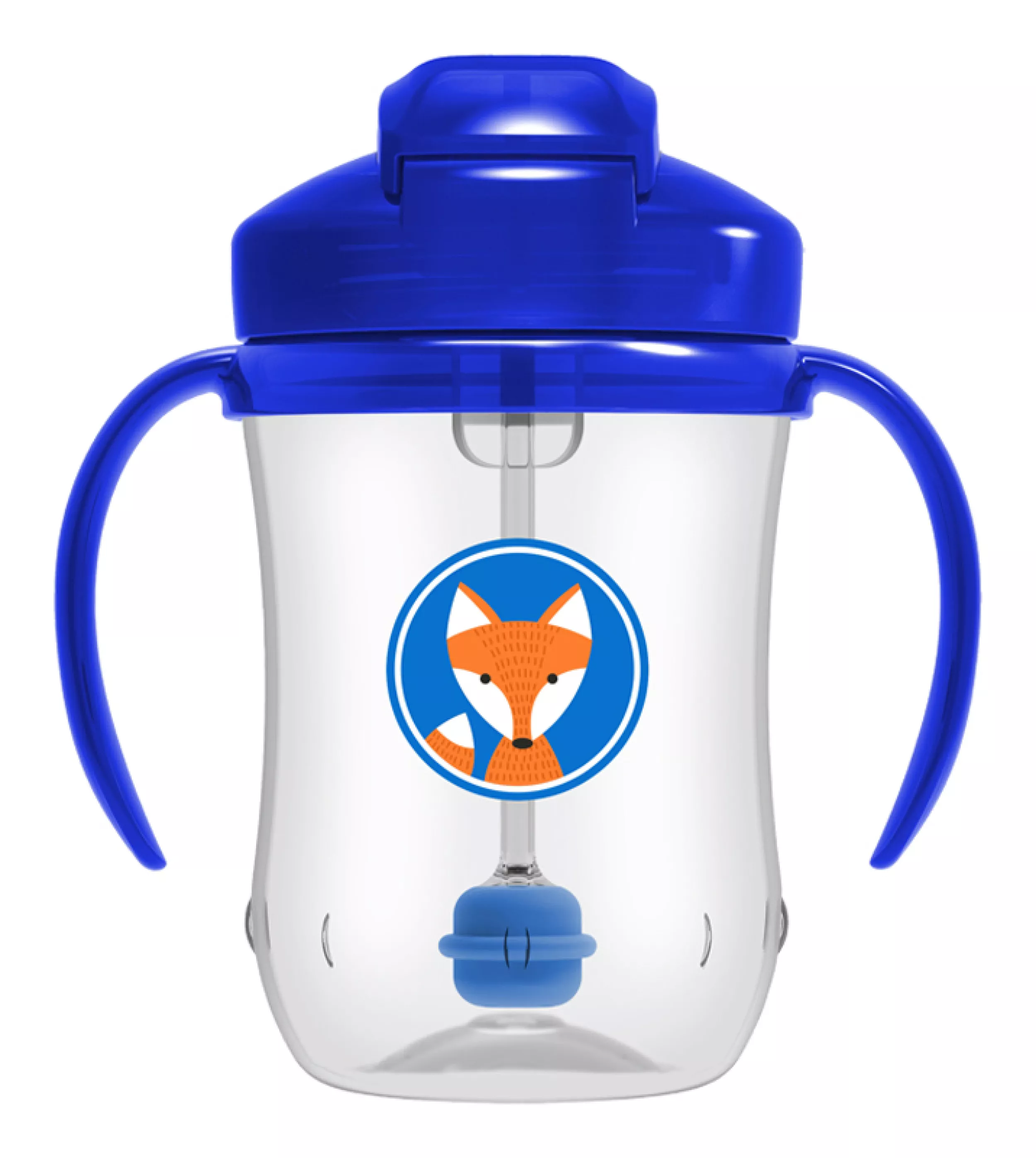 Becher mit weichem Silikonstrohhalm 270 ml, geeignet für Kinder ab 6 Monaten. Ermöglicht einen einfachen Übergang vom Trinken aus der Flasche zum Trinken aus der Tasse. Das Baby kann beim Trinken den Becher umdrehen (genau wie beim Saugen aus einer Flasche) oder lernen, in vertikaler Position zu trinken. BPA-frei.
