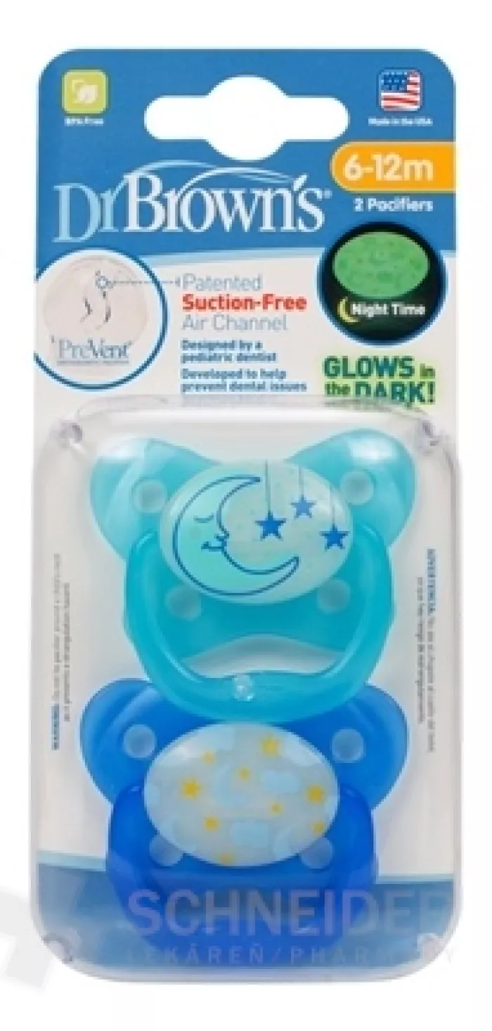 Kieferorthopädische, leuchtende PreVent-Schnuller für Kinder im Alter von 6 bis 12 Monaten. Packungsinhalt 2 Stk.