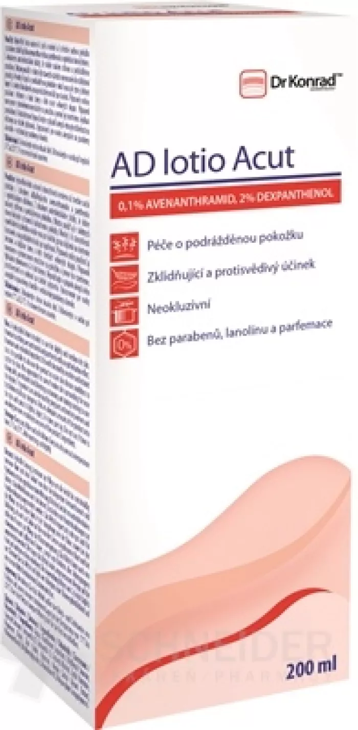 Dr. Konrad AD Lotion Acut – hydrophile Lotion zur Pflege leicht bis mäßig trockener Haut, enthält beruhigendes Avenanthramid und Panthenol mit epithelisierender Wirkung. Enthält antimikrobielle Inhaltsstoffe. Es wird von empfindlicher und gereizter Haut gut vertragen. Es kann auch bei akuten Hauterkrankungen zur Beruhigung der Haut eingesetzt werden. Es eignet sich auch zur Pflege gereizter Haut um die Nase bei Schnupfen, zur Behandlung der Brustwarzen während der Stillzeit und bei gereizter Haut nach dem Sonnenbad. Auch schwangere und stillende Frauen sowie Kinder aller Altersgruppen können das Präparat verwenden.