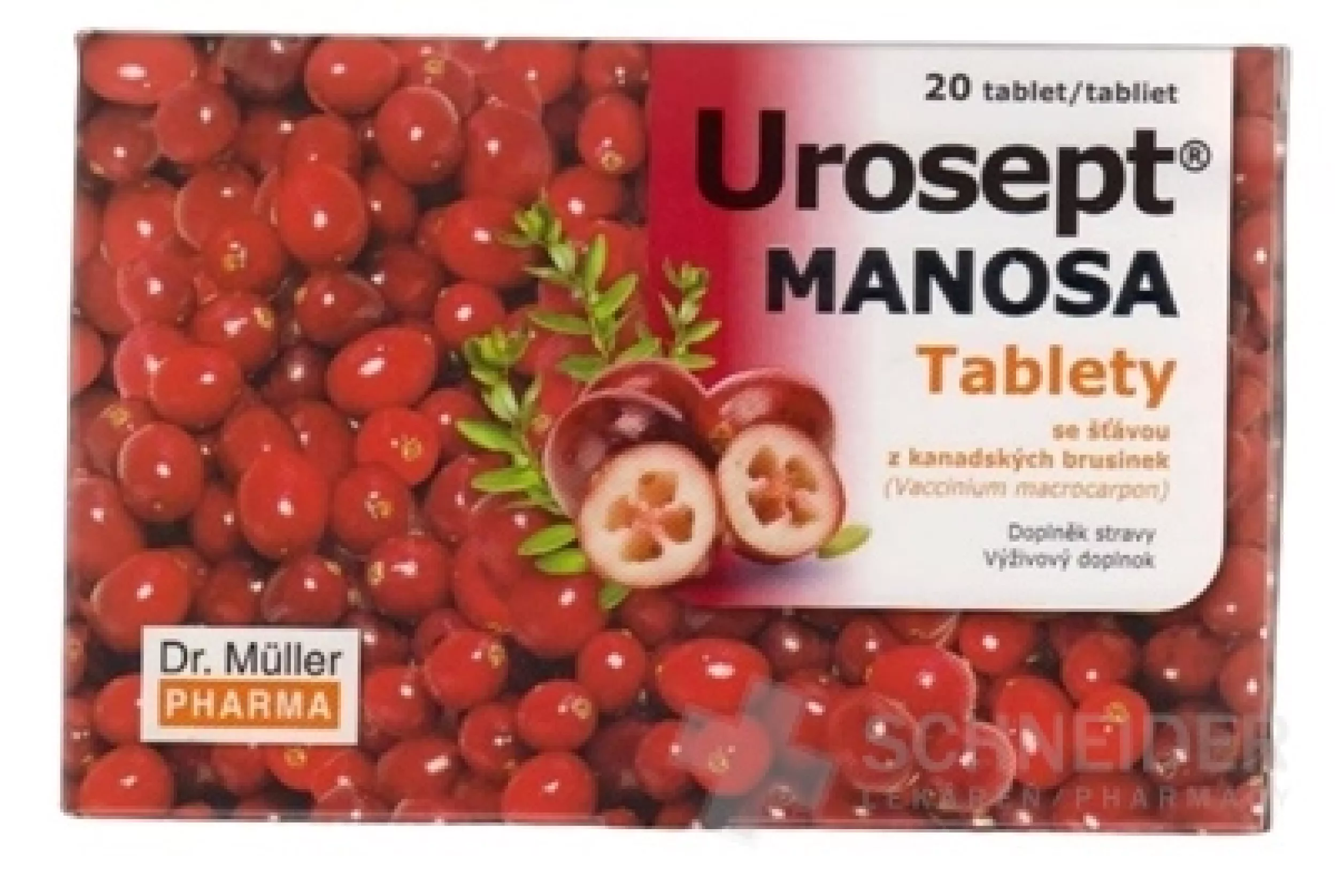 Nahrungsergänzungsmittel mit Mannose, mit Saft aus kanadischen Preiselbeeren (Vaccinium Macrocarpon) und Extrakt aus den Blättern der Bärentraube (Arctostaphylos uva-ursil).