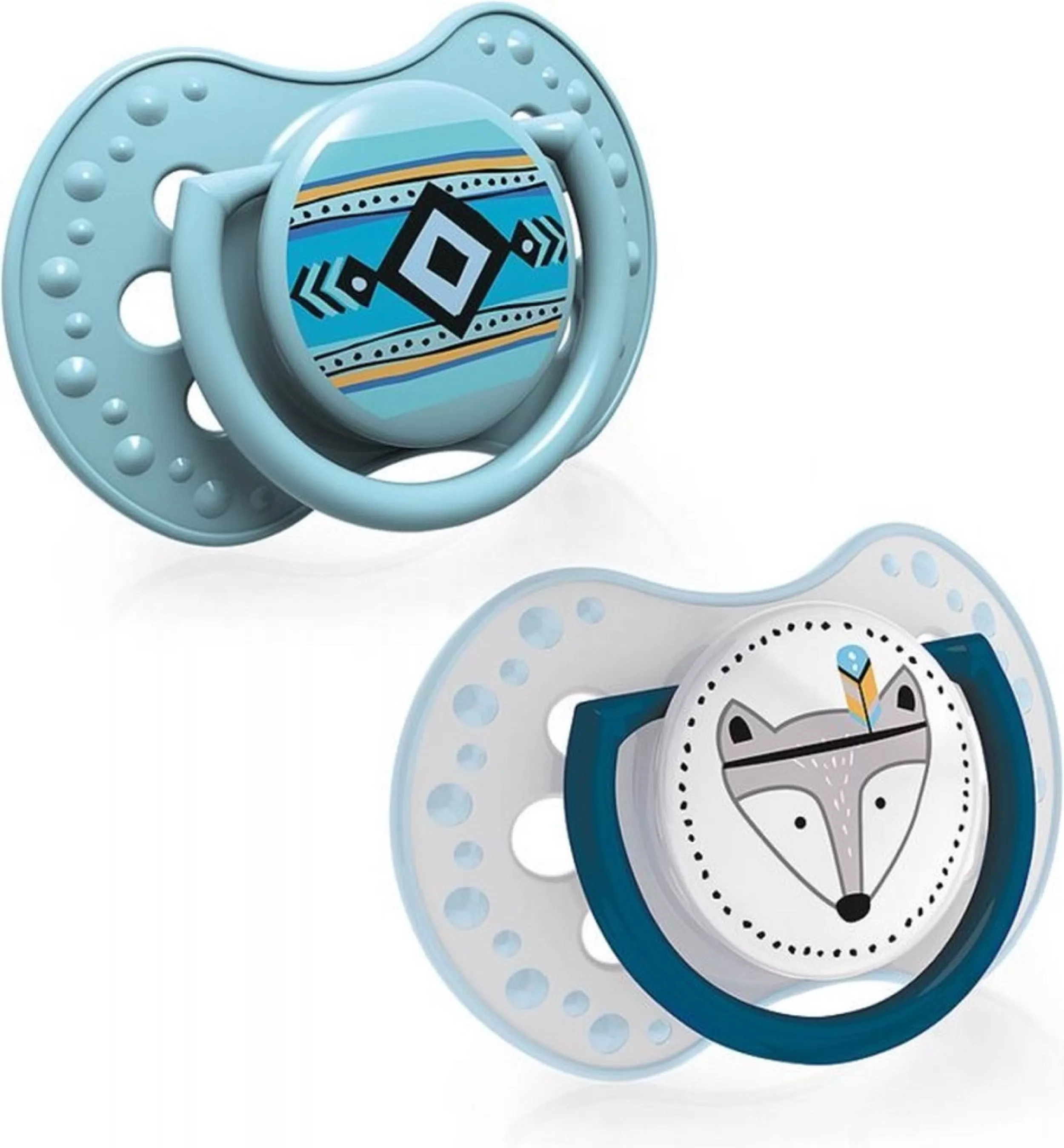 - Das Etikett in Form einer Acht verfügt über große Belüftungslöcher, die die Ansammlung von Speichel hinter dem Etikett verhindern und so einer Reizung der empfindlichen Babyhaut vorbeugen.