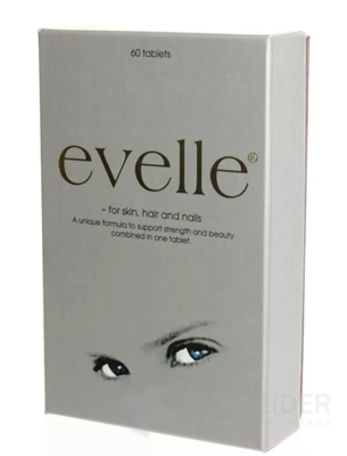 Das Nahrungsergänzungsmittel Evelle enthält Vitamine (C, E, Biotin) und Mineralstoffe (organisch gebundenes Selen, Zink und Silizium).