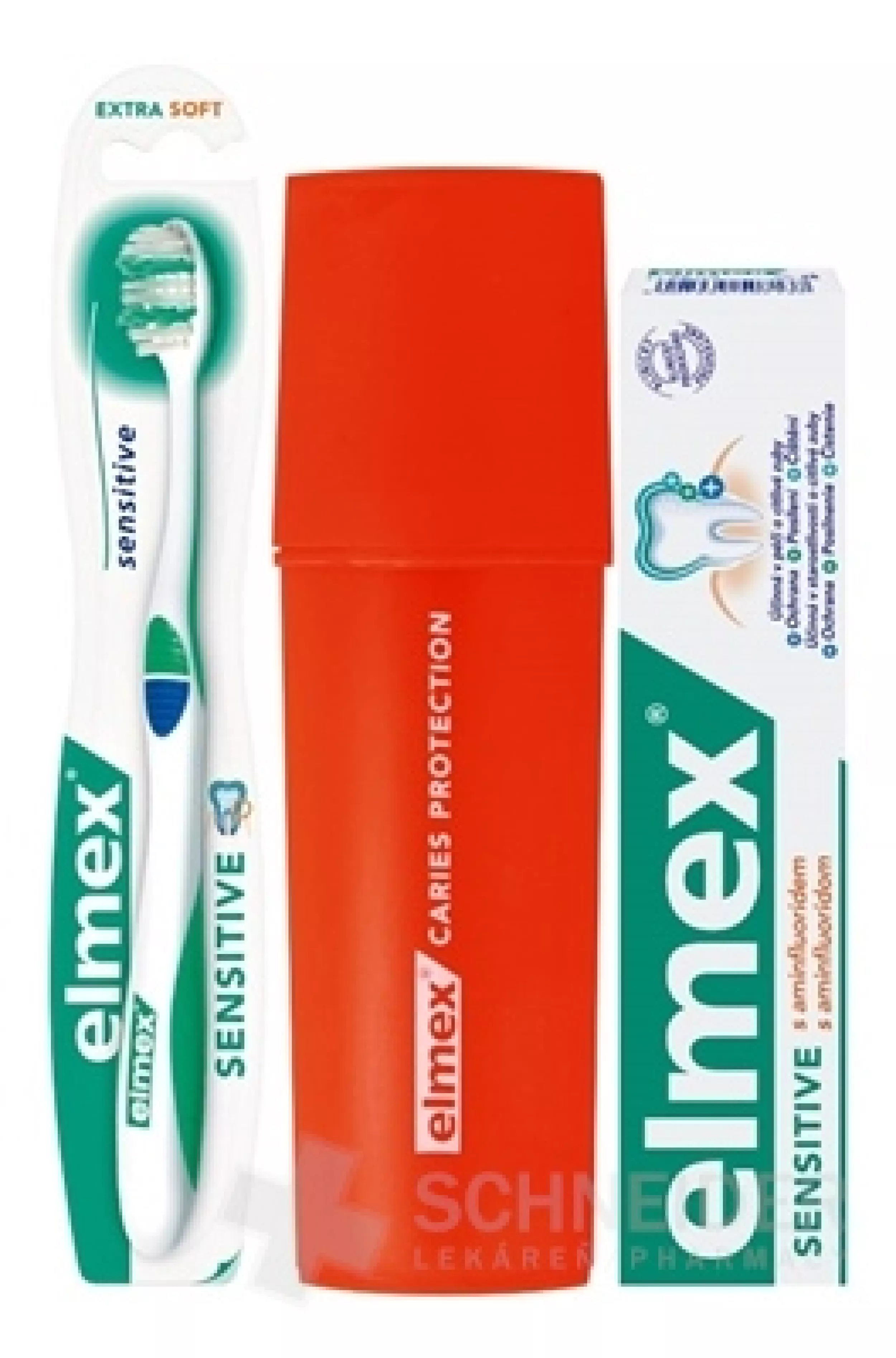Im Set enthalten sind die Zahnpasta elmex® SENSITIVE, die Zahnbürste elmex® SENSITIVE EXTRA SOFT und ein praktisches Etui.
