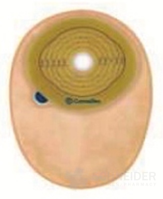 Einteiliger Kolostomiebeutel ESTEEM+, undurchsichtig, mittelgroß. Der Beutel ist geschlossen und für Stomaaufnahmen mit Kolonausgang (Patienten mit Kolostomie) konzipiert, um den gebildeten Stuhl aufzufangen, der zusammen mit dem Beutel entfernt wird.