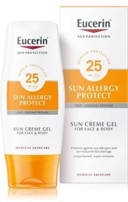Eucerin Schützendes Sonnencreme-Gel gegen Sonnenallergie LSF 25 wurde speziell für die Haut entwickelt, die zu Sonnenallergien neigt. Seine innovative Technologie bietet wirksamen Schutz vor UV-Schäden und Sonnenallergien: Das hochwirksame, photostabile UVA/UVB-Filtersystem mit dem Tinosorb S-Filter schützt zuverlässig vor Hautverbrennungen. Das hochwirksame Antioxidans pflanzlichen Ursprungs Alpha-Glucosyl-Rutin (AGR) stärkt zusammen mit dem UVA-Schutz das hauteigene Schutzsystem gegen freie Radikale, die wichtigsten Auslöser von Sonnenallergien. Die meisten Sonnenallergien, wie z Die polymorphe Lichteruption (PLE) wird durch die Reaktion des Immunsystems auf oxidativen Stress verursacht, der auftritt, wenn UV-Strahlung (am häufigsten UVA) die Bildung freier Radikale in Hautzellen verursacht. Diese Immunreaktionen können zu Entzündungen in Form stark juckender Bläschen, Furunkel oder Pusteln führen. Die Zusammensetzung dieses Cremegels ist nicht fettend, wasserfest. Es enthält keine Emulgatoren und Duftstoffe und ist für sehr empfindliche oder lichtempfindliche Haut geeignet. Klinische Studien haben die Wirksamkeit und Hautverträglichkeit von Eucerin Sunscreen Sunscreen Gel SPF 25 bei Menschen mit Sonnenallergie gezeigt.
