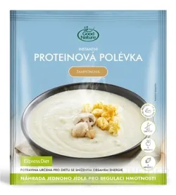 Cremige Pilzsuppe mit hohem Proteingehalt und niedrigem Kohlenhydrat-, Fett- und Kaloriengehalt, gewürzt mit Zwiebeln, Knoblauch, Kräutern und Gewürzen. Mit Zucker.