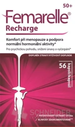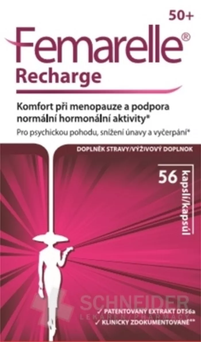 Das Nahrungsergänzungsmittel Femarelle® Recharge enthält patentierten fermentierten Sojaextrakt (DT56a), Leinsamen und Vitamin B6, das zur Regulierung der hormonellen Aktivität, zur Verringerung von Müdigkeit und Erschöpfung, zur normalen Funktion des Nervensystems, zur psychischen Aktivität und zum normalen Energiestoffwechsel beiträgt.