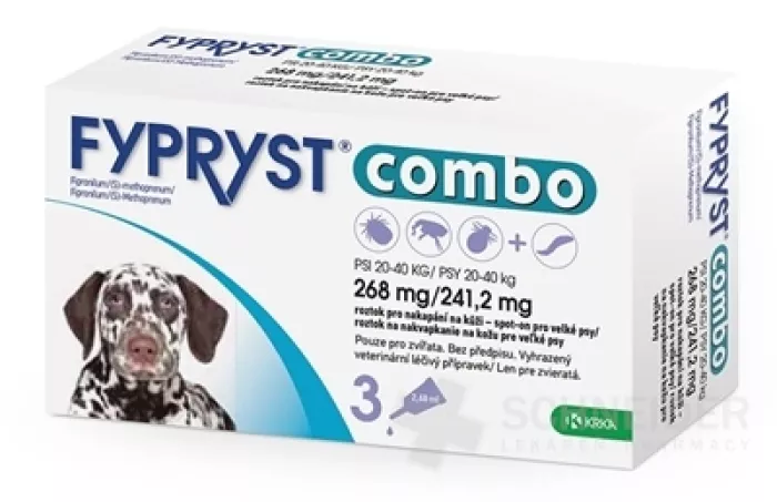FYPRYST Combo 268 mg/241,2 mg Lösung zum Einträufeln auf die Haut für große Hunde (von 20 kg bis 40 kg). Es enthält eine Kombination aus zwei Wirkstoffen: Fipronil und Methopren. Die Lösung ist in Pipetten enthalten. Jede Pipette enthält: