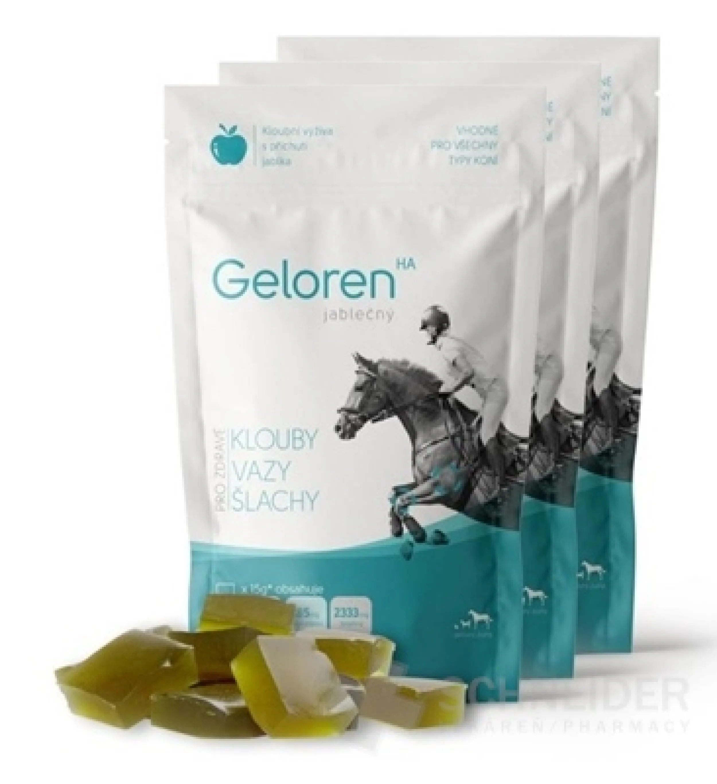Ergänzungsfuttermittel für Pferde. Gelatinewürfel (Kautabletten) mit Apfelgeschmack für aktive Tiere.