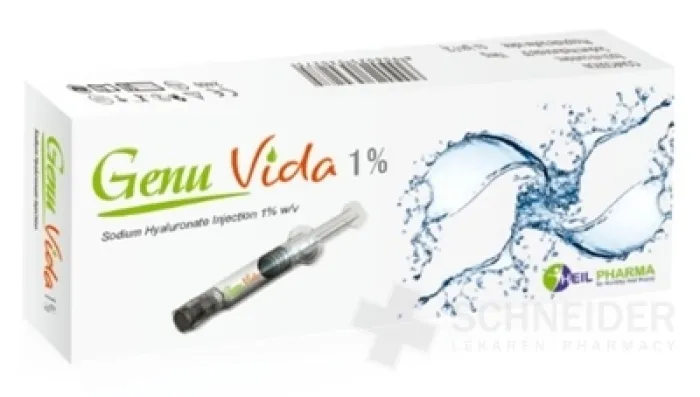 Genu Vida 1 % ist ein steriles, pyrogenfreies, transparentes viskoelastisches Präparat aus hochreinem, nicht entzündungshemmendem Natriumhyaluronat mit hohem Molekulargewicht. Die Lösung enthält 10 mg/ml Natriumhyaluronat EP, gelöst in physiologischer Phosphatpufferlösung (pH 6,8–7,5). Das Polymer besteht aus wiederholten Disaccharideinheiten von N-Acetylglucosamin und Natriumglucuronat, die durch glykosidische Bindungen ß I3 und ß 1-4 verbunden sind. Natriumhyaluronat ist eine physiologische Substanz, die in der extrazellulären Matrix des Bindegewebes weit verbreitet ist.
