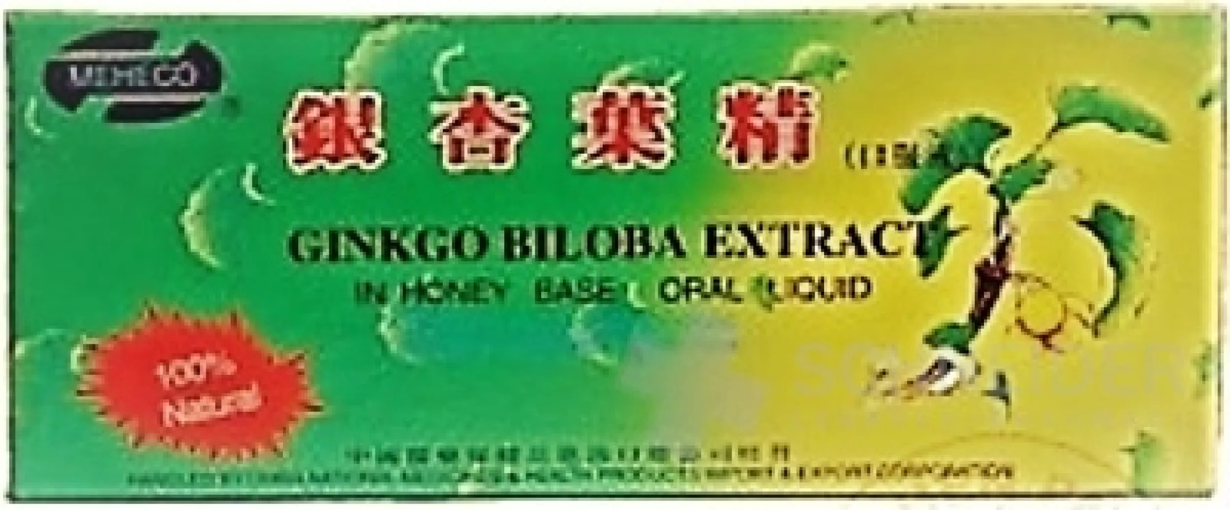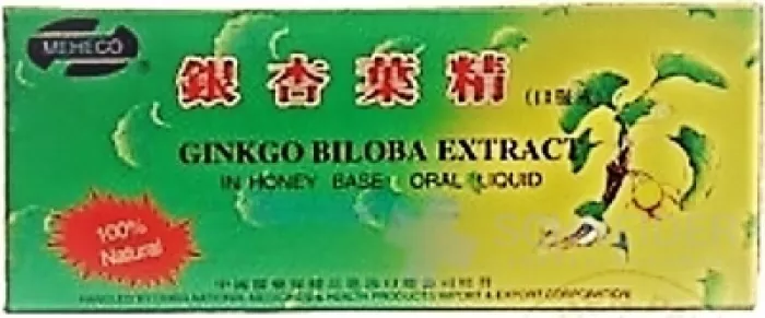 Nahrungsergänzungsmittel in Ampullen, enthält Ginkgo-Biloba-Blattextrakt, Honig, Wasser, Kaliumsorbat.