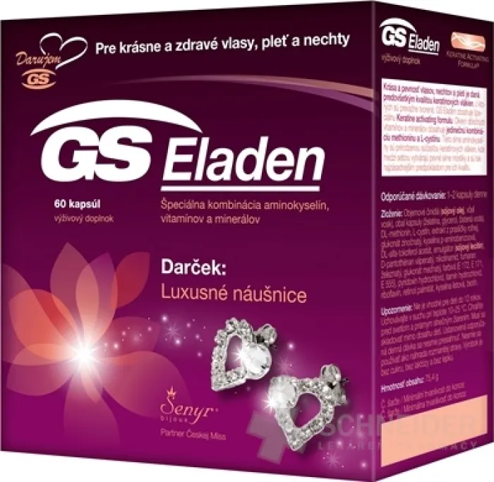 Das Nahrungsergänzungsmittel GS Eladen enthält eine Kombination aus Aminosäuren, Vitaminen und Mineralstoffen – Keratine Activating Formula®, die den Körper mit Substanzen versorgt, die für den Stoffwechsel der Keratinozyten notwendig sind. Es nährt Haare, Haut und Nägel aus dem Körper heraus und trägt so zu einer Verbesserung ihrer Qualität und ihres Aussehens bei: