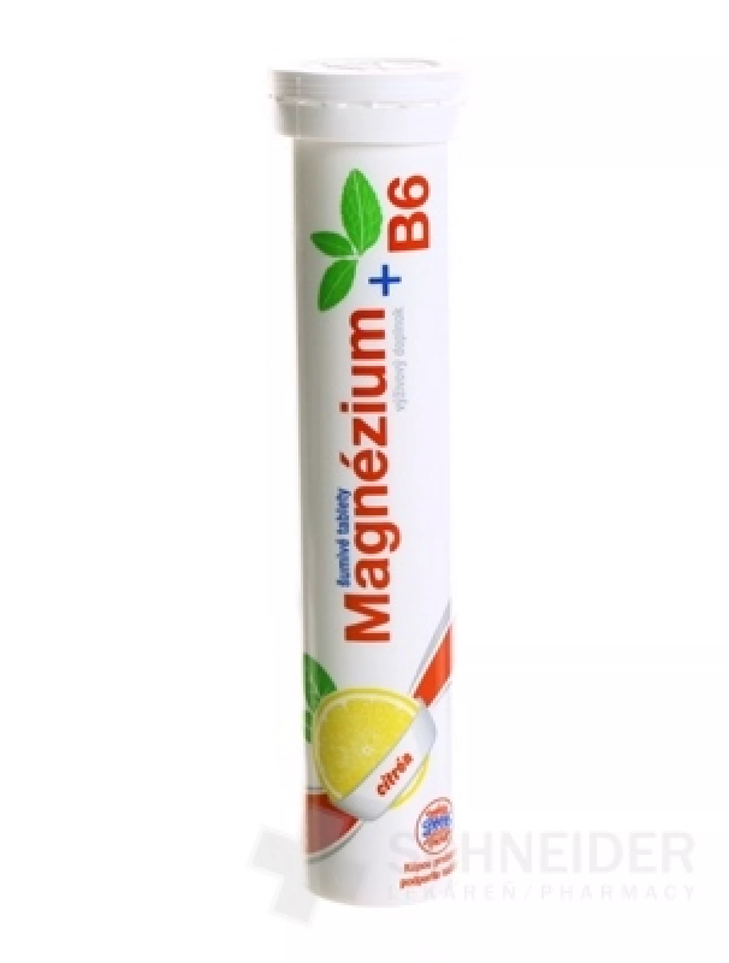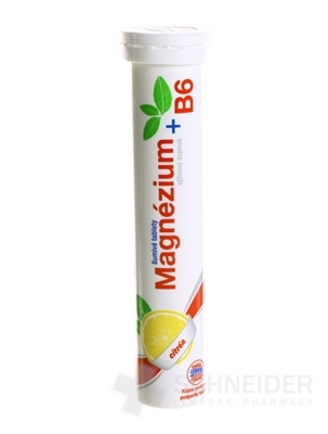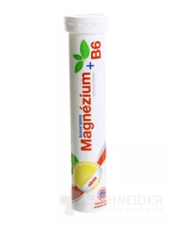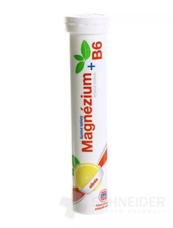 Nahrungsergänzungsmittel, Brausetabletten mit Magnesium und Vitamin B6 mit Süßstoff (Sucralose) und natürlichem Zitronengeschmack zur Ergänzung der täglichen Magnesiumzufuhr.