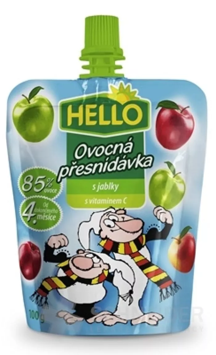 Fruchternährung mit Äpfeln und Vitamin C. Verpackung mit Kindermärchenmotiv - Kremienok und Chocholúšik.