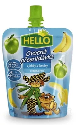 Fruchternährung mit Äpfeln, Bananen und Vitamin C. Verpackung mit Kindermärchenmotiv – Kubu Kubikula.