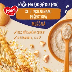 Getreidebasierte Nahrung in Pulverform für Säuglinge und Kleinkinder ab dem 8. Monat. Eine Portion Brei pro Tag hilft dabei, nach und nach neue Geschmacksrichtungen von Getreide oder Früchten einzuführen und gesunde Ernährungsgewohnheiten zu entwickeln. Zum Abendessen eignet sich Hami-Milchbrei mit 7-Getreide-Biskuit ohne Zuckerzusatz (enthält natürlichen Zucker).